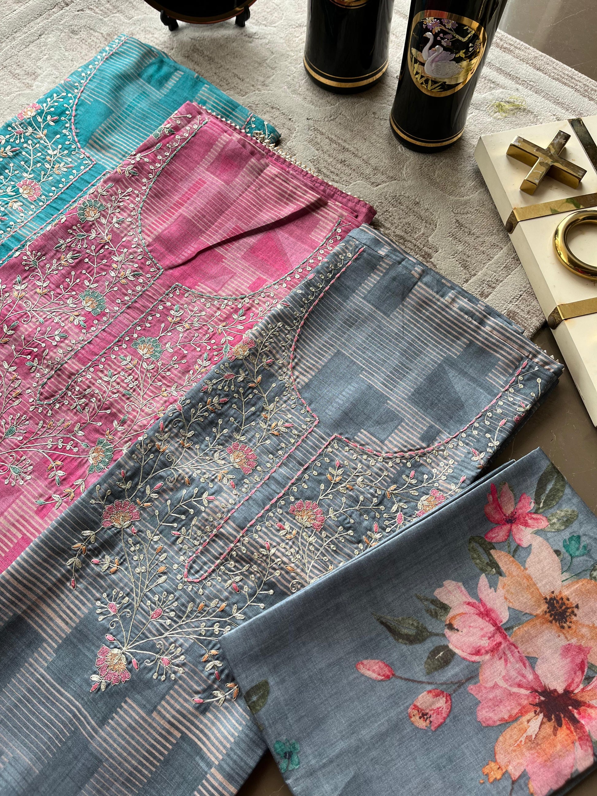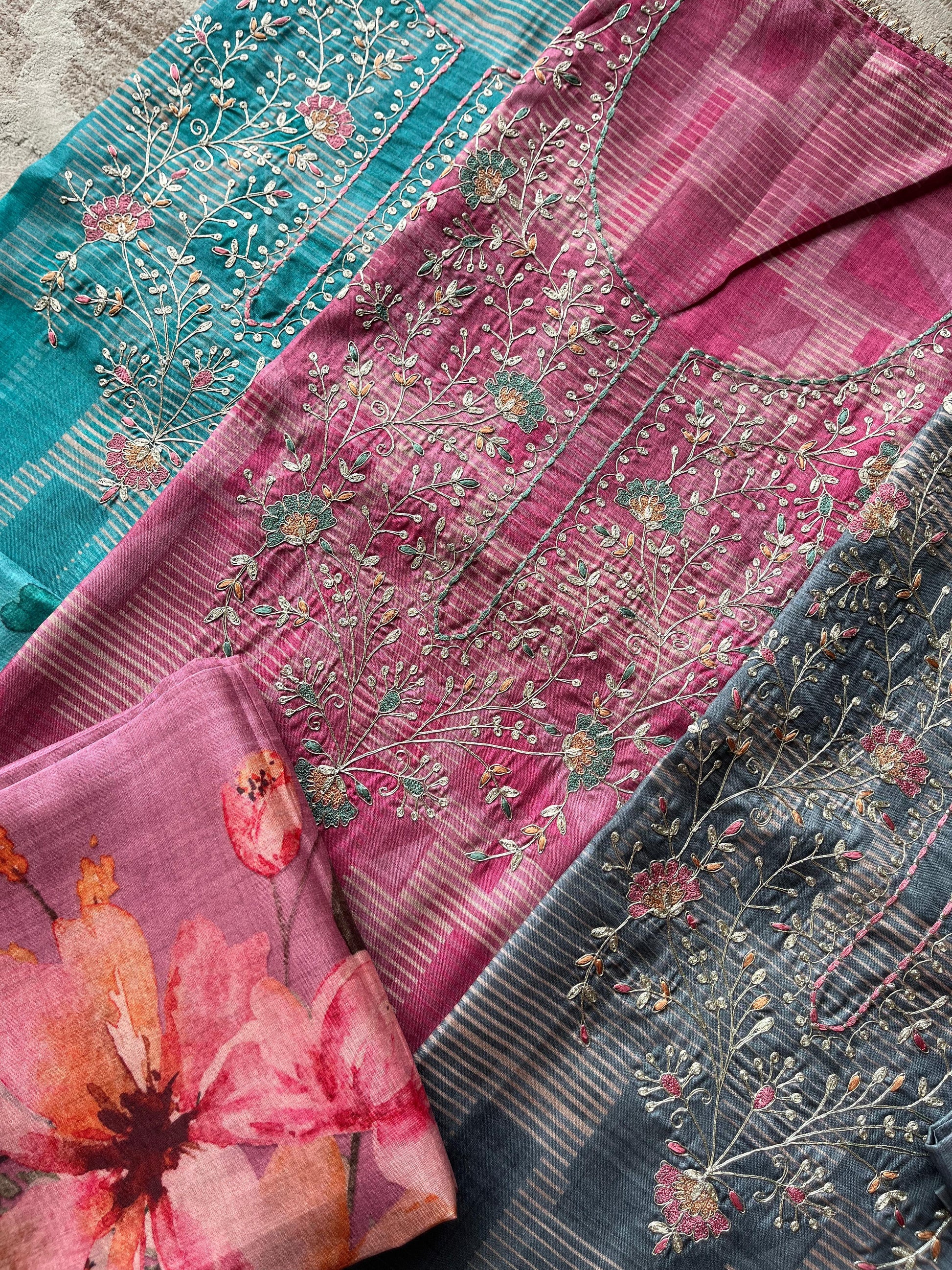 Top: Printed Art Tussar silk Unstitched salwaar kameez with Embroidery on the Neck.